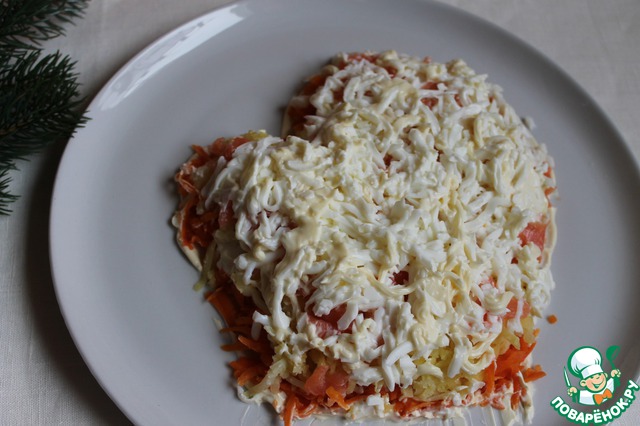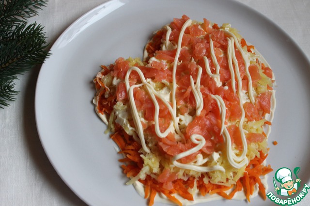 Выкладываем нашу морковь. Не заходим за контур. Сверху делаем сеточку из майонеза.