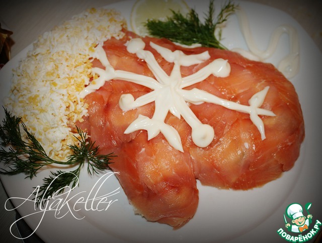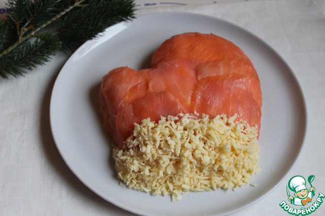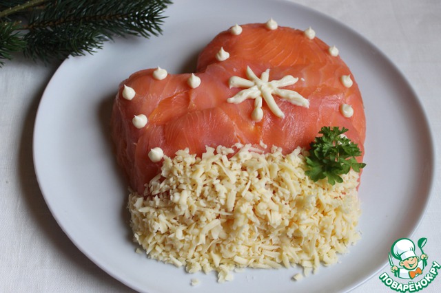 Теперь мы тонкими ломтиками рыбы выкладываем бока варежки. Далее верх аккуратно.