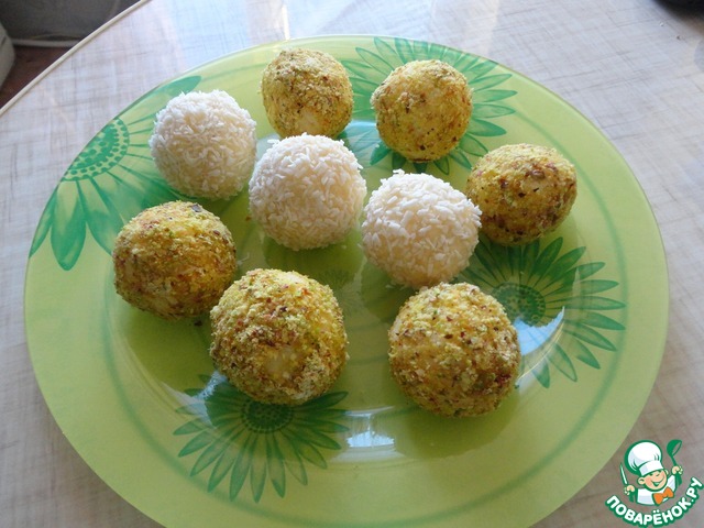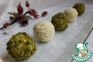 Обваливаем теперь в кокосе и фисташках. Можно заменить фисташки на кунжут.