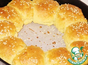 Дно формы выстелить бумагой для выпечки. Бортик и дно обмазать маслом. Положить шарики из теста близко друг к другу. Придать форму круга. Кулинарной кистью смочить булочки сверху молоком ( 2 ст. ложки), посыпать кунжутом.
