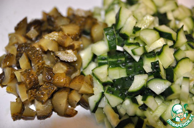 Также кубиками нарезаем свежие и маринованные огурцы.