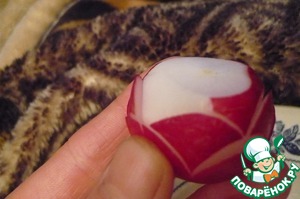 Сначала займемся редисом. Помоем и обрежем с двух сторон так, чтобы поучились бочата.