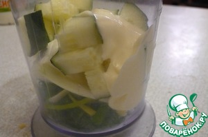 Пока чашки из редиса сохнут, нарезать огурец на 12 тонких кружочков и делаем наш крем. Кладем в блендер остатки огурца, лук, сельдерей, майонез, сыр, половину укропа и взбить.