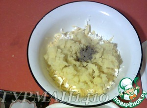 13. Высыпаем картофель к сыру, добавляем черный молотый перец по вкусу.