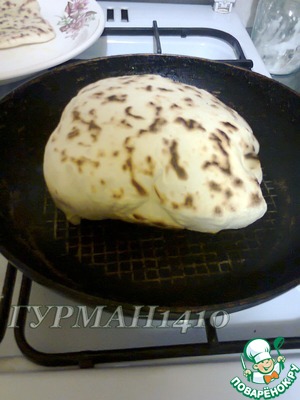 23. Через 2-3 минуты лопаточкой перевернуть хачапури, накрыть крышкой и сделать средний огонь. Жарим еще 2-3 минуты. Хачапури раздувается как шар – он готов.