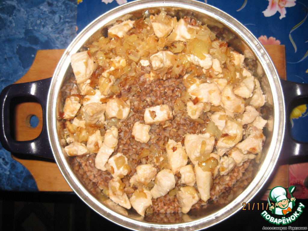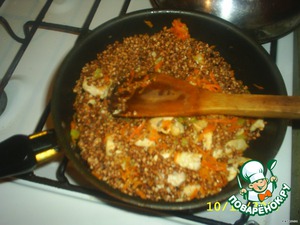Гречку промыть высыпать на сковороду! Тушить под крышкой 10 минут!