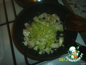 Курицу обжарить на оливковом масле 3 минуты, приправить смесью перцев.