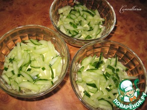 Огурец нарезать соломкой, выложить 2-м слоем.