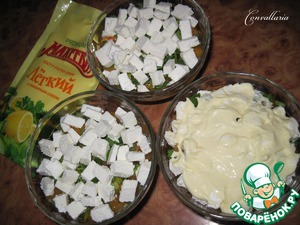 Сыр нарезать небольшими кубиками, выложить 5-м слоем и смазать заправкой.