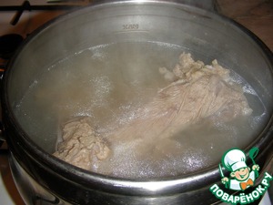 Кладём лопатку в кипящую воду, так лучше сварится мясо, и бульон будет прозрачнее, и варим приблизительно 1 час до мягкости, солим.