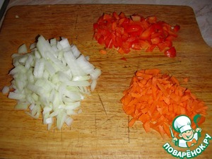 Пока варится мясо, режем кубиками морковь, лук, сладкий перец и добавляем в готовый мясной бульон, варим около 15 мин.