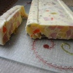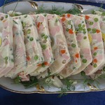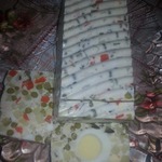 Незадолго до подачи перевернуть салат-желе на блюдо, украсить мозаикой из цветного перца и листьев петрушки.