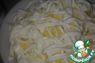 Желатин замочить в бульоне, оставшемся от курицы, он должен хорошо набухнуть, затем слегка подогреть и перемешать. Желатин должен полностью распуститься в бульоне. Если желатин не растворился за один раз, снова немного подогреть, но не кипятить ни в коем случае! Добавить майонез, тщательно перемешать венчиком.