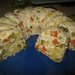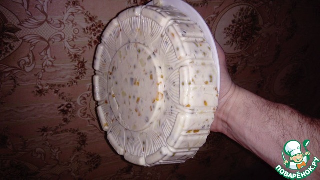 После этого берем форму (у меня форма от какого-то покупного печенья, что очень удобно - она гибкая и позволяет легко извлечь застывший салат), кладем половину салата, вдавливаем отварные очищенные яйца и закрываем их сверху оставшимся салатом. Накрываем пленкой и убираем в холодильник.