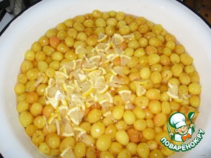 В таз с кипящим сиропом пересыпаем черешню, предварительно слив солено-кислую водичку. Можно наоборот: черешню залить горячим сиропом и поварить 5 минут с момента закипания. Добавить нарезанный дольками лимон.