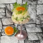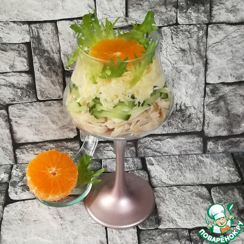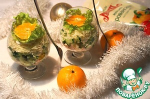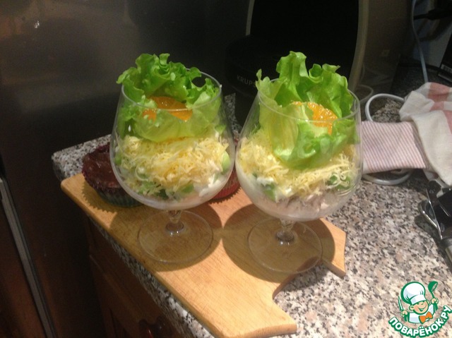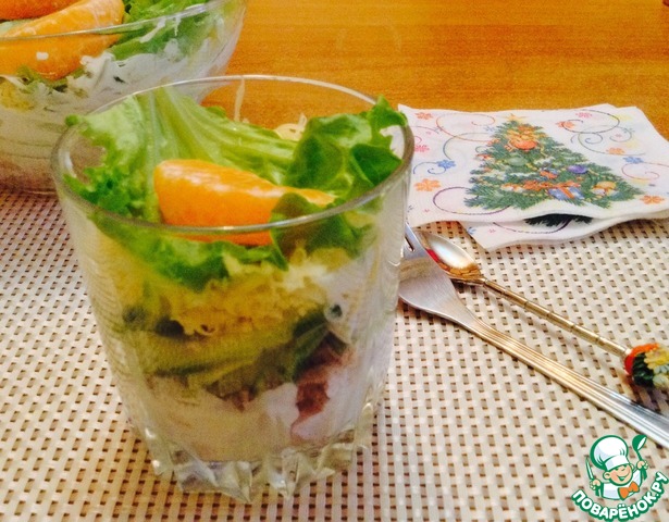 Сверху слой сыра, на него салатный лист и украсить долькой мандаринки