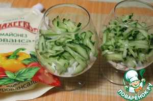 Начинаю сборку: на дно бокалов выложить куриную грудку, смазать соусом