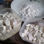 Самое долгое - резать и обваливать) За резку взялась уже через 4 часа: присыпала сверху, перевернула на рабочую поверхность, сняла плёнку, присыпала низ, оказавшийся вверху. Резала круглым ножом для пиццы, смазанным растительным маслом: удобнее и быстрее, чем обычным.