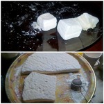 На рабочую поверхность просеять крахмал и сахарную пудру, смешанные 1:1. Застывшую смесь выложить на стол, аккуратно отделить пленку – масса еще липкая. Партиями нарезать ее на кусочки. Нож присыпаем крахмалом или же слегка смазываем маслом. Резать лучше не "пилящими" движениями, а сверху вниз давить ножом.