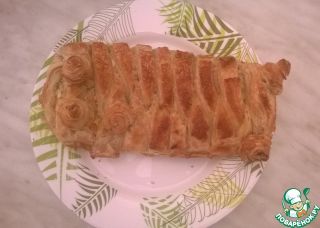Завернуть внахлест на начинку край теста, который мы оставили целым. В месте складок, по бокам, также разрезаем тесто на две ленты. -