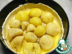 Половинки картофеля разложить на тесте срезами вниз, посолить, поперчить.