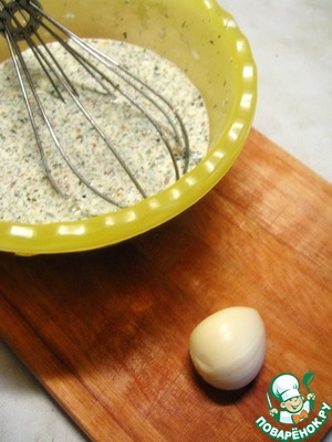Взбить яйца со сливками и пряной зеленью. Посолить, поперчить по вкусу, добавить рубленый чеснок.