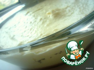 Взбить желтки с сахаром в крепкую пену, добавить сыр, коньяк, перемешать, но не взбивать, до исчезновения комочков. Ввести в массу растопленный желатин, затем взбитые сливки.