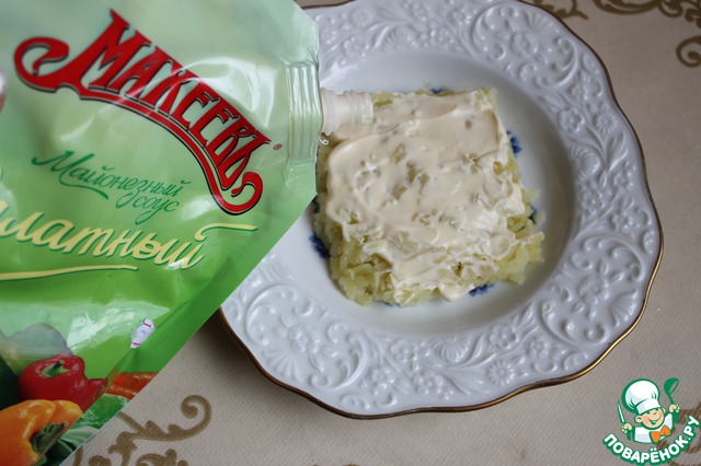 Далее у нас идет нарезанный лук. Его надо заранее обдать кипятком. Сверху также сетка из соуса.