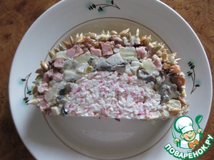 2 слой - равномерно выложить грибы с яйцами по всему ежику, не забывая сохранять форму.