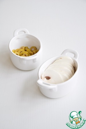 Нарезать оливки без косточек кружочками, шляпки свежих грибов очистить от кожицы. Свежие и шампиньоны в собственном соку нарезать так, как вам больше нравится.