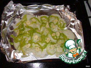 Добротно смазываем подсолнечным маслом, и слоями выкладываем лук - перец - чеснок. -