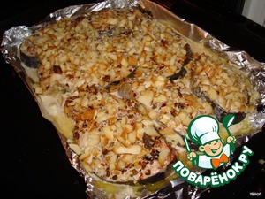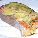 Через 20 минут заливаем рыбу майонезной смесью, посыпаем сыром. В этот раз я использовала копченую косичку - интересный эффект. А так голландский сырок - замечательно подходит.