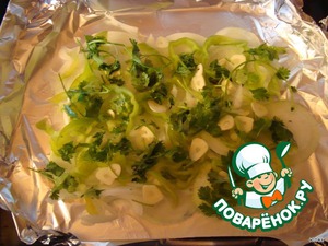 Кинза - на любителя. Многие не любят ее запах, поэтому не настаиваю, но рассказываю - половинку пучка этой травки разминаем руками, рвем (не режем), и раскладываем на противень.