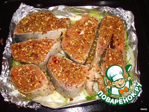 Рыбу солим, обсыпаем специями и выкладываем на лук. (если мариновали, соответственно, выкладываем сразу). Касательно специй - у нас на рынке продают специи "Для всего", не знаю, что конкретно туда входит, но явно имеется красный перчик ;)