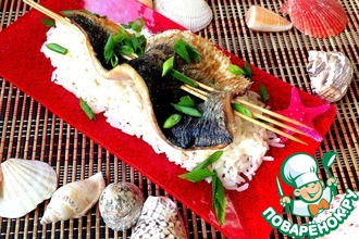 Следующий слой - рыба. Рыбу делим на 4 части (по количеству порций).