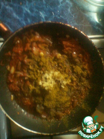 Добавляем приправы и специи, выдавливаем чеснок через пресс, перемешиваем и тушим под крышкой 5 мин.