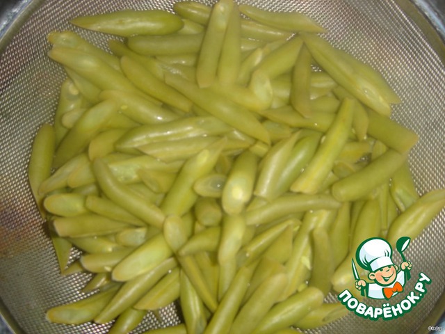 • Фасоль очистить от стеблей, промыть, нарезать кусочками в 3-4 см по диагонали и отварить в подсоленной воде с добавлением ложки уксуса. Отваренную фасоль охладить.