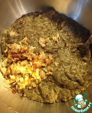 Получается такая серая каша, в которую добавляем лук и перемешиваем. -