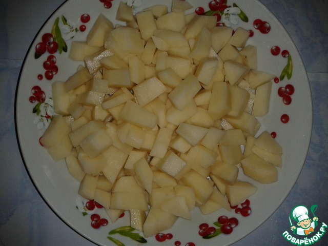 Нарезаем кусочками. Так-то кусочки должны быть большими, но я предпочитаю маленькие (они готовятся быстрее и мягче становятся).