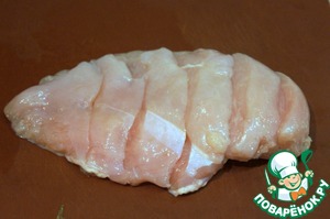 С филе срезать жир, обмыть, хорошо обсушить. Сделать поперечные надрезы немного наискосок.