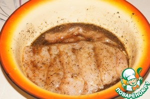 Залить маринадом, немного "помассировать" мяско, чтобы маринад попал в разрезы. Отставить на 30 минут, за которые несколько раз перевернуть мясо.