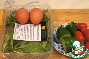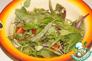 Названия пока нет, только вчера придумала салатик. Нас, северян, редко зимой балуют экзотическими салатами. Нет, совсем без зелени мы не сидим, конечно. В соседнем городе есть тепличный комбинат, который выращивает в горшочках обычный салат. А тут вижу в супермаркете Микс салатов производства Италии. Обалдеть!!! Такая коробочка, а в ней смесь из рукколы, латтугино красного и восточных салатных трав. Все почищено, вымыто, обсушено, можно сразу в тарелку. Ну, как пройти мимо. Конечно, купила и полетела домой, по дороге придумывая, что бы такого сотворить, свеженького... чтобы летом пахнуло. Что получилось, представляю на ваш суд.
