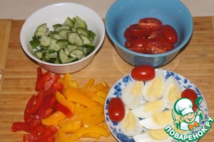 Яйца сварить, остудить, очистить и разрезать на 4 дольки. Помидорчики разрезать пополам (4 шт. оставить целыми - для украшения).