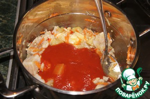 И томат-пасту (или измельченные в блендере помидоры). В моем случае это Помито. Потушить 5 минут.