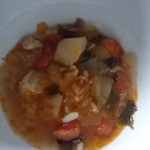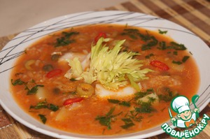 Морковь и корень сельдерея нарезать кубиками или нашинковать соломкой, лук (я использовала порей, нарезанный полуколечками) и чеснок измельчить. Стебель сельдерея нарезать тонкими ломтиками. Мелко нарезать кусочек острого перчика. Лучше это сделать в перчатках.