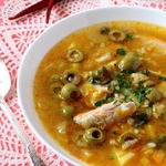 Влить в кастрюлю рыбный бульон, добавить промытый рис, каперсы и оливки.