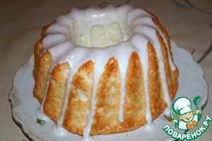 Ангельский бисквит принято подавать следующим образом: поставить его на плоское блюдо, в центр выпустить взбитые сливки и украсить их свежими фруктами. Но сливок у меня не оказалось под рукой, поэтому я полила бисквит лимонной глазурью