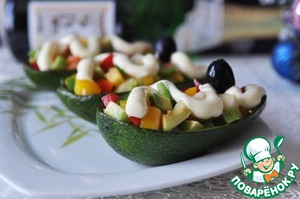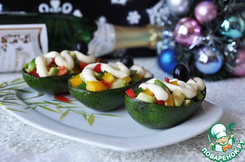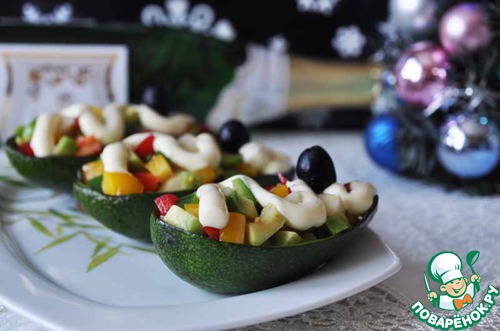 Берём сервировочное блюдо, выкладываем на него шкурки от авокадо, наполняем их салатом.