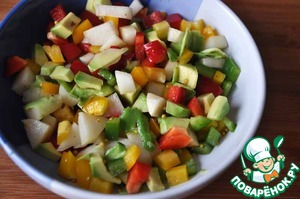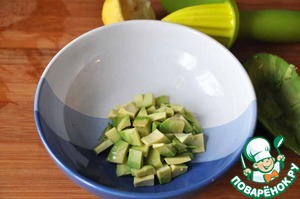 Мякоть авокадо нарезаем кубиками и сбрызгиваем соком лимона для предотвращения потемнения (окисления).