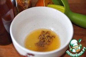 Из апельсина выдавливаем сок, добавляем горчицу с зёрнами, уксус красный винный, мёд, соль, свежемолотую смесь перцев.
